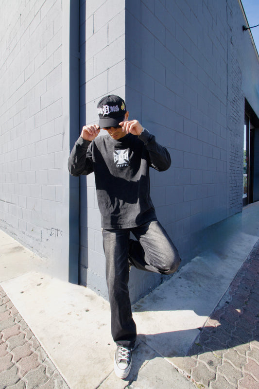 “CHOPPA” LONG SLEEVE TEE IN STONE-WASHED BLK
